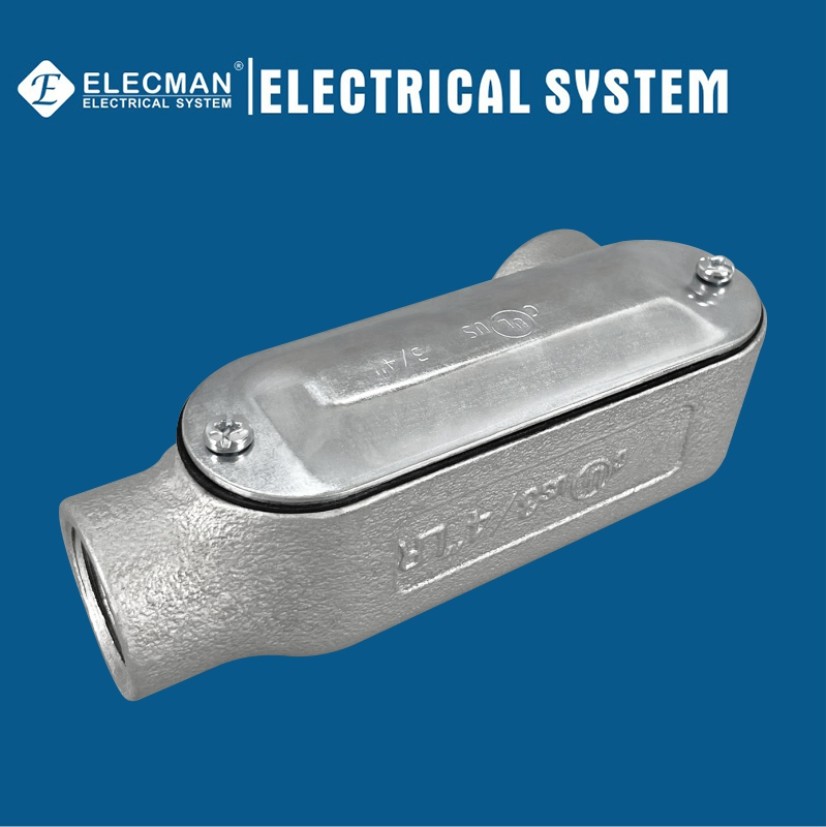 O ® de ELECMAN forma 5 o ferro maleável 1/2” - 4" corpos da canalização de IMC/Rigid rosquearam a LR que o tipo é usado com canalizações e saque de Rigid/IMC como puxar os encaixes que fazem curvaturas e conectam corridas da canalização no sistema da canalização. Projeto traseiro liso e volume interno cúbico para assegurar uma instalação pura e compacta ao fornecer o acesso para emendar, puxando, manutenção.