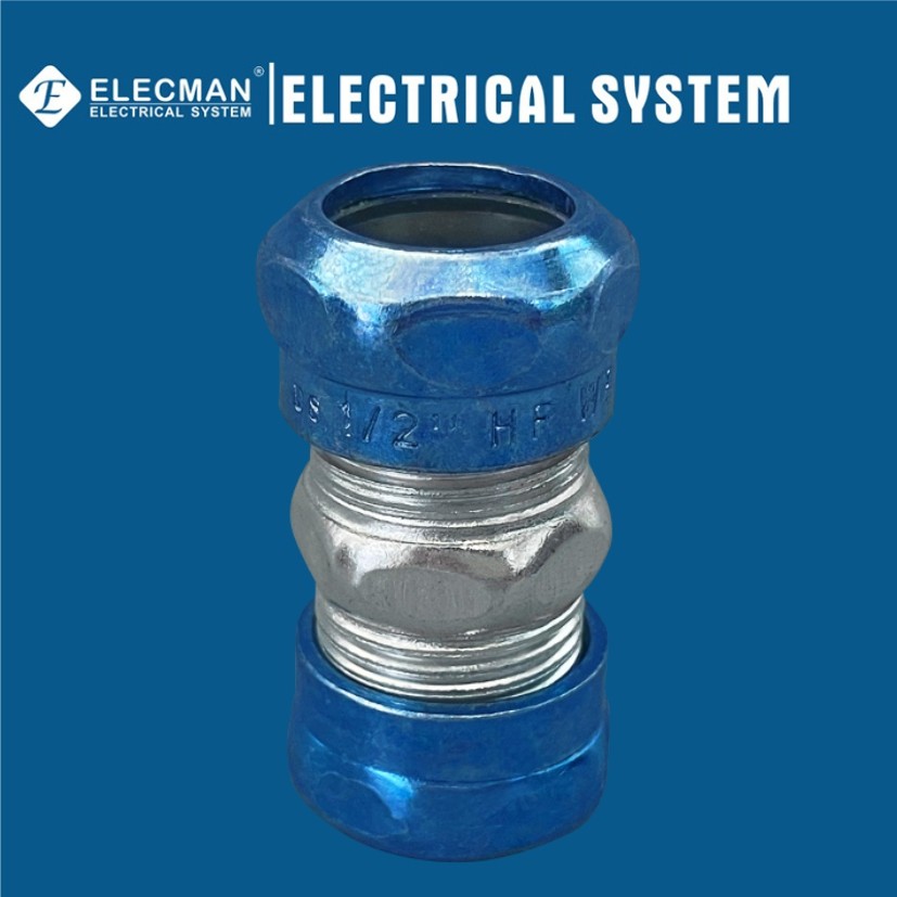 O tipo de acoplamento impermeável de aço UL da compressão de ELECMAN® EMT alistou 1/2” - 4" são usados em lugar molhados, pares duas extremidades da canalização com acoplamentos da compressão. Projetou cumprir com as exigências impermeáveis atuais do teste (2008 NEC 358,42 e 314,15.). Para a inspeção fácil, “o lugar molhado” é marcado em todos os encaixes. Disponível nos tamanhos de comércio de 1/2 dentro. com 4 dentro.
