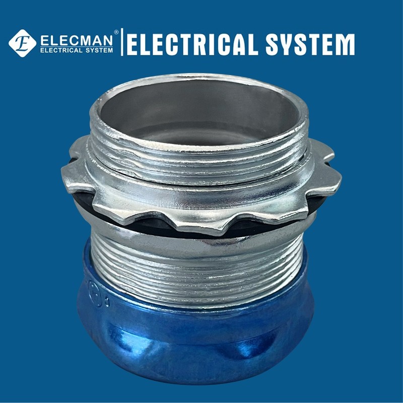 Os conectores de aço impermeáveis de ELECMAN® EMT Compression são zinco galvanizado para a proteção de corrosão excelente em lugar úmidos. Os conectores impermeáveis da compressão de EMT vêm com o apropriado pre-montado fazendo o pronto para instalar na canalização. os conectores Chuva-apertados da compressão são instalados como todo o outro encaixe de aço da compressão de EMT e não exigem nenhuma ferramenta especial. os conectores Chuva-apertados da compressão são usados em lugar molhados para ligar canalizações finas da parede de EMT às caixas ou aos cercos de junção elétricas.