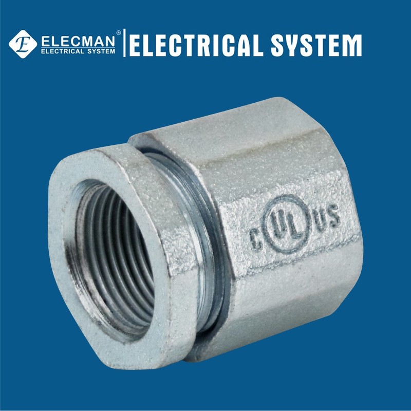 ELECMAN® electrogalvanizou o ferro maleável rosqueou o acoplamento de 3 partes aos pares e eficazmente aos fins rosqueados bond de Rigid/IMC onde nenhum comprimento da canalização pode ser girado. Fornece in-line o acoplamento rígido aterrar de alta qualidade, não o afrouxará sob a vibração. As linhas apropriadas livres asseguram o conjunto fácil.